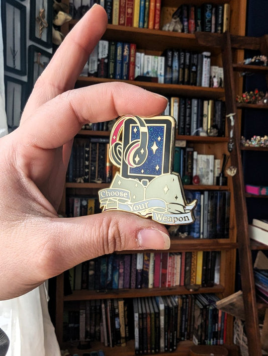 Choose Your Weapon- book lover enamel pin