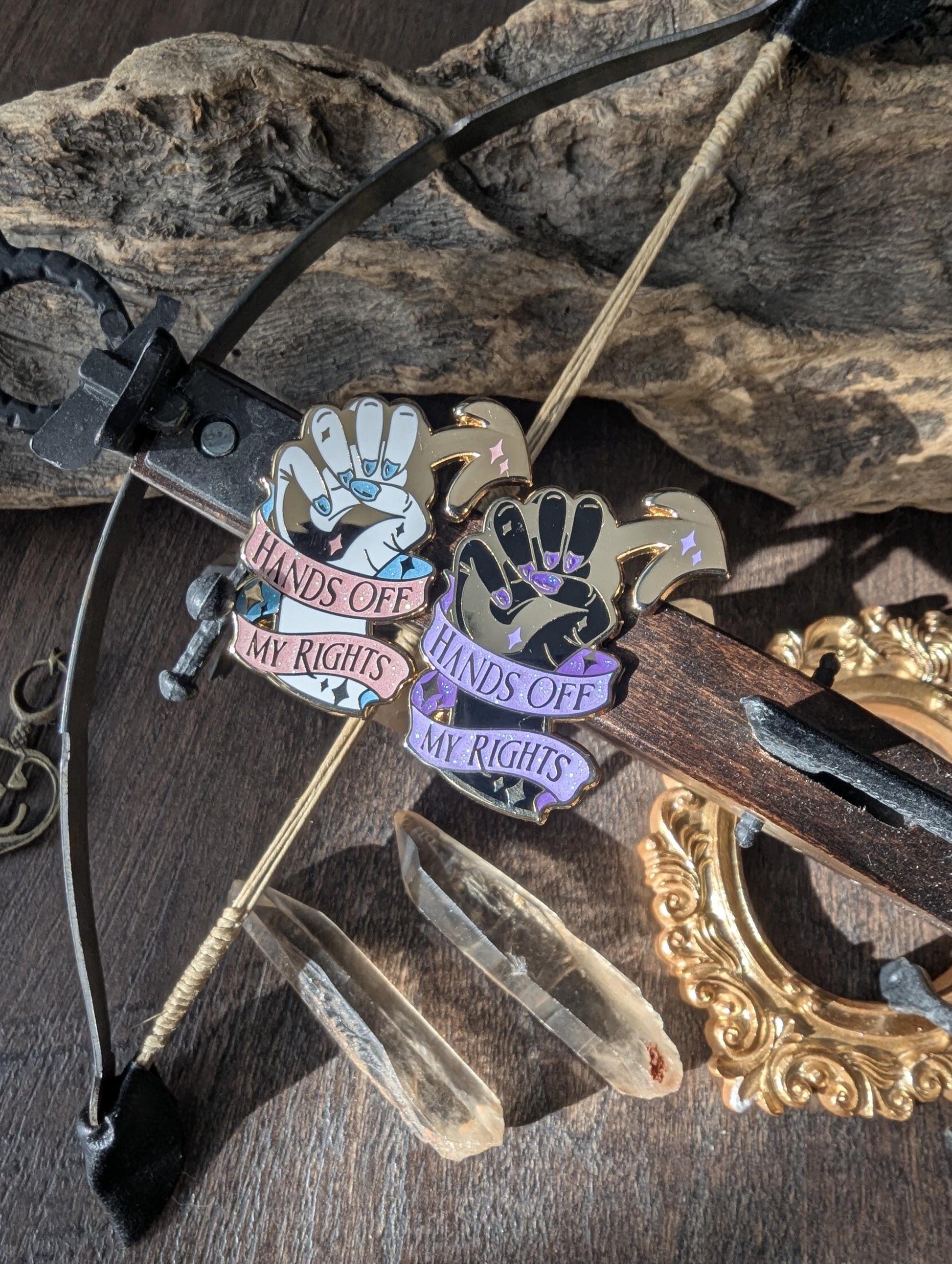 "Hands off my rights" represents a fist grabbing a symbol with a banner surrounding it. Hands off my rights is an enamel pin that's part of the feminine rage collection, an inclusive, feminist, intersectional set of enamel pins and stickers designed by me! This pin is available in two colourways- "white pink and blue" and "black and purple". Please select from the drop down menu the variation you want!